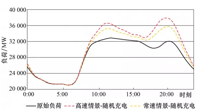 單輛電動汽車充電負荷曲線由充電起始時間及持續(xù)充電時間決定,而電動汽車群充電負荷由多輛單體電動汽車充電負荷曲線疊加而成。本研究基于上海電動汽車數(shù)量增速及電動汽車用戶調(diào)研,測算了電動汽車充電負荷曲線。結(jié)果顯示(見圖4),在電動汽車高增速情景下,電動汽車充電負荷高峰為6.33GW,出現(xiàn)于晚間19:00點左右,充電負荷低谷為15MW,出現(xiàn)于凌晨4點左右;疊加電動汽車充電負荷曲線后,電網(wǎng)負荷高峰為37.93GW,出現(xiàn)于晚間20:00左右,充電負荷低谷為21.07GW,出現(xiàn)于上午6:00左右,電網(wǎng)負荷峰谷差從11.90GW增加到16.86GW。綜合來看,在隨機充電情況下,電動汽車充電負荷將顯著提升傍晚電力負荷高峰,且全天峰谷差也將有所增加,從而對電網(wǎng)運行產(chǎn)生一定壓力。