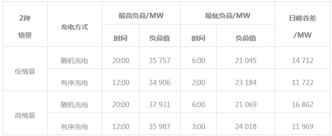 圖6顯示了2種電動汽車發(fā)展情境下,隨機充電及有序充電負荷曲線,可見有序充電使電網(wǎng)高峰負荷一定程度降低,負荷峰谷差明顯減小,大部分充電負荷轉(zhuǎn)移至凌晨負荷低谷時段。