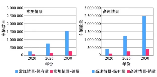 上海私人購買電動汽車享受免費牌照及現(xiàn)金補貼政策,考慮到上海市目前高達數(shù)萬元的牌照價格,扶持政策無疑有力激勵了電動汽車發(fā)展??紤]到現(xiàn)行的機動車限號及財稅扶持政策在未來存在一定的不確定性,研究設(shè)定2種電動汽車發(fā)展情景,即常規(guī)發(fā)展情景和高速發(fā)展情景(見圖2)。