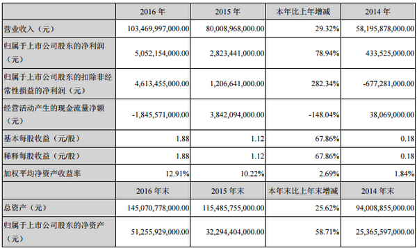 比亞迪表示,2016年,公司歸屬于母公司股東的凈利潤(rùn)2016年為人民幣5,052,154千元,較2015年人民幣2,823,441千元增加78.94%,主要是本期新能源汽車(chē)業(yè)務(wù)利潤(rùn)增加所致。