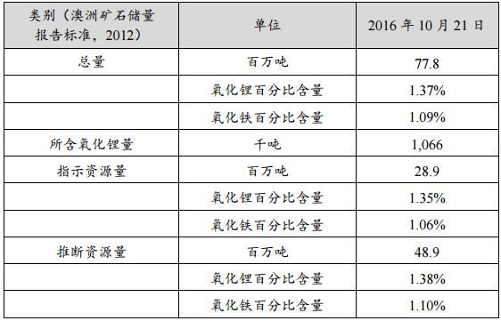 根據(jù) RIM 公司對(duì) Mt Marion 鋰礦項(xiàng)目進(jìn)行加密和擴(kuò)展鉆探勘探工作的研究結(jié)果更新說(shuō)明,Snowden Mining Industry Consultants 對(duì)Mt Marion 鋰輝石礦項(xiàng)目截至 2016 年 10 月 21 日的礦產(chǎn)資源修訂評(píng)估估算如下:
