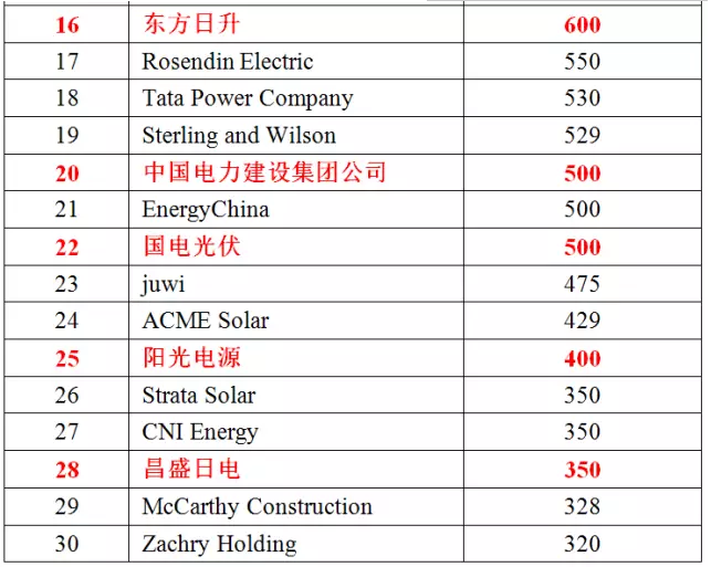 得益于2016年中國(guó)新增裝機(jī)35.54GW,約占世界總裝機(jī)的47%。因此,全球EPC企業(yè)30強(qiáng)中,包含13家中國(guó)企業(yè),2016年的EPC工程總規(guī)模在350MW~1505MW,它們2016年具體的業(yè)績(jī)?nèi)缦卤硭尽?