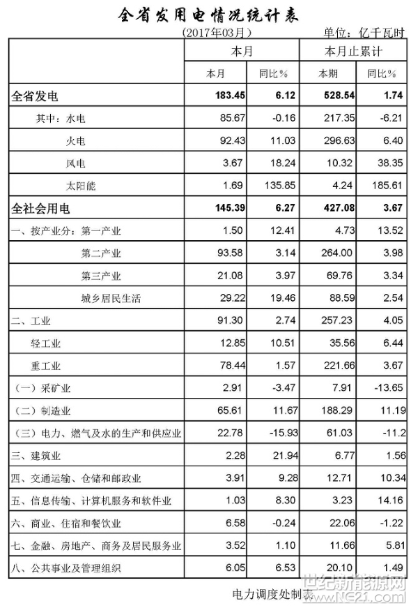3月份,全省發(fā)電183.45億千瓦時(含三峽53.08億千瓦時),增長6.12%。不含三峽,發(fā)電130.38億千瓦時,增長10.53%,其中:水電發(fā)電32.59億千瓦時,增長5.49%;火電發(fā)電92.43億千瓦時,增長11.03%。
