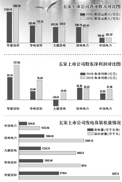 比照2016年與2015年的經(jīng)營(yíng)業(yè)績(jī),五大發(fā)電旗下主要上市公司基本延續(xù)了2015年?duì)I業(yè)收入下降的趨勢(shì),但盈利情況卻出現(xiàn)了極具戲劇性的“反轉(zhuǎn)”:上一報(bào)告期唯一一個(gè)出現(xiàn)凈利潤(rùn)下滑的國電電力,在2016年獲得了營(yíng)業(yè)收入和歸屬股東凈利潤(rùn)的雙提升;其他四家則正好相反,凈利潤(rùn)降幅超過三成甚至腰斬,上期凈利的增長(zhǎng)根本無法覆蓋2016年的下跌,以至2016年的凈利水平低于2014年。2015年凈利漲幅最高的大唐發(fā)電,2016年則虧損約26.23億元。