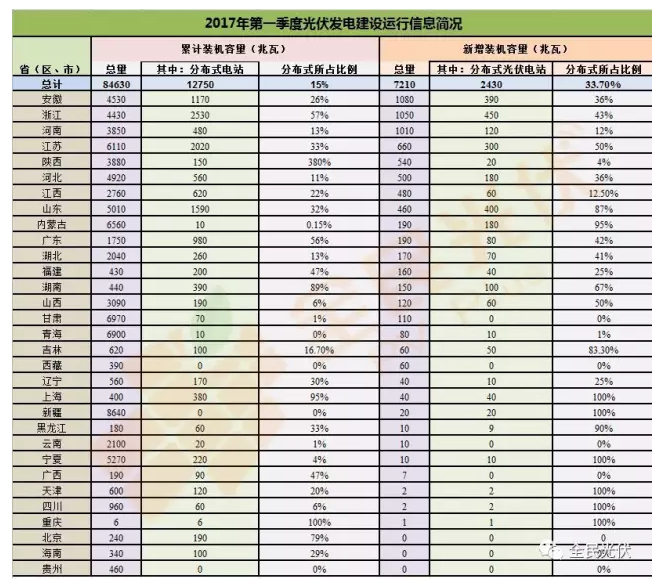 數(shù)據(jù)顯示我國累計光伏發(fā)電裝機(jī)容量達(dá)到84.6 GW,其中,光伏電站43.3 GW,分布式光伏12.7 GW。2017年一季度新增裝機(jī)達(dá)到7.21 GW,與2016年同期基本持平。其中,集中式光伏電站新增裝機(jī)4.78 GW,同比下降23%;分布式光伏新增裝機(jī)2.43 GW,同比增長151%。新增裝機(jī)呈現(xiàn)集中式光伏電站降速和分布式光伏發(fā)電提速的態(tài)勢。