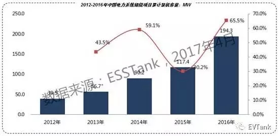 ESSTank分析認(rèn)為之所以有大量企業(yè)開(kāi)始關(guān)注儲(chǔ)能市場(chǎng),主要原因在于儲(chǔ)能在電力系統(tǒng)中有著廣泛的應(yīng)用前景。儲(chǔ)能系統(tǒng)在電力系統(tǒng)的發(fā)電、輸電、配電和用電等各個(gè)環(huán)節(jié)均存在較大的市場(chǎng)空間,但是由于成本、市場(chǎng)機(jī)制等多方面因素,目前在國(guó)內(nèi)仍以示范性的項(xiàng)目為主。從化學(xué)儲(chǔ)能裝機(jī)容量來(lái)看,截止到2016年年底,國(guó)內(nèi)電力系統(tǒng)化學(xué)儲(chǔ)能累計(jì)裝機(jī)容量達(dá)到194.3MW,同比增長(zhǎng)65.5%。其中鋰離子電池占比達(dá)到75.5%。