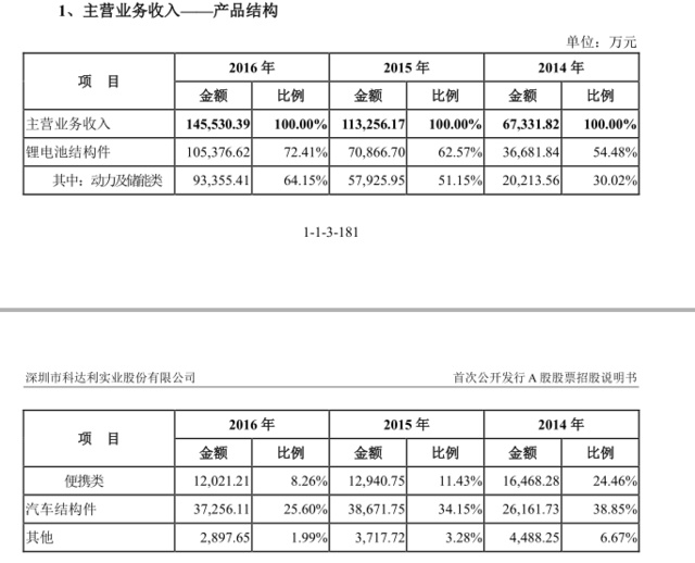 從科達(dá)利的招股說(shuō)明書(shū)中可以看到,今年來(lái)科達(dá)利動(dòng)力電池結(jié)構(gòu)件占比逐年上升,2016年僅動(dòng)力及儲(chǔ)能類(lèi)電池輔件已達(dá)到了9億的銷(xiāo)售規(guī)模。