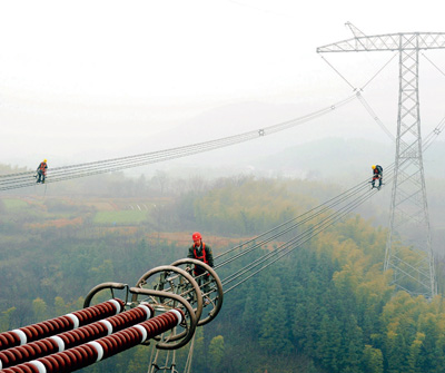 圖為工作人員在對向家壩—上海±800千伏特高壓直流輸電線路檢修。