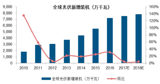 從全球光伏市場需求來看,經(jīng)過前期的市場增長,目前中、日、美光伏裝機需求均逐步進入穩(wěn)態(tài)化發(fā)展,對于全球光伏裝機的增量貢獻逐步減弱。但是,受益于光伏成本的持續(xù)快速下降,光伏發(fā)電在印度、東南亞、南美等地區(qū)的優(yōu)勢逐步顯現(xiàn),多個新興地區(qū)國家陸續(xù)出臺支持光伏發(fā)展的相關政策,帶動新興市場光伏裝機維持平穩(wěn)增長。整體來看,認為后期全球光伏需求仍將維持穩(wěn)定增長趨勢,預計2017、2018年全球光伏裝機有望達到75、80GW,年化增長5%左右。
