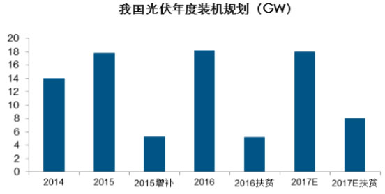 另一方面,隨著光伏扶貧模式逐步清晰、精準扶貧效果日益顯現(xiàn)等,我國明顯加大對光伏扶貧支持力度,2016年下發(fā)光伏扶貧規(guī)劃約4.5GW,2017年目標預計在8GW左右,光伏扶貧的快速增長同樣將為國內(nèi)光伏行業(yè)裝機提供保證,預計后期國內(nèi)光伏裝機仍將維持平穩(wěn)發(fā)展趨勢。
