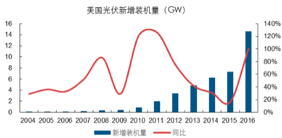 在補貼政策平穩(wěn)的背景下,近年來光伏發(fā)電成本持續(xù)下降,從而使得美國光伏電站投資回報率持續(xù)上行,帶動資金投資意愿上升,而這點將是保證后期美國市場平穩(wěn)增長的根本驅(qū)動力。近年來美國光伏裝機持續(xù)維持快速增長,預計后期增長趨勢仍將維持。