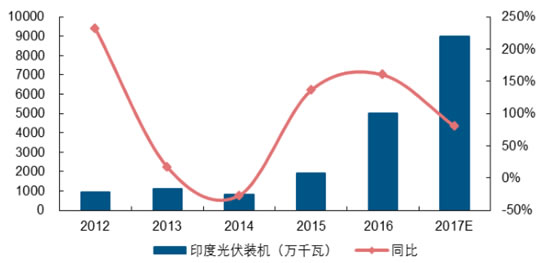 印度市場是后期全球光伏主要的新增市場之一,受益于政策支持,2015年印度實現(xiàn)光伏裝機約2GW。根據(jù)相關數(shù)據(jù),預計2016印度裝機將達到4.8GW以上,2017年裝機有望沖擊8-10GW水平。