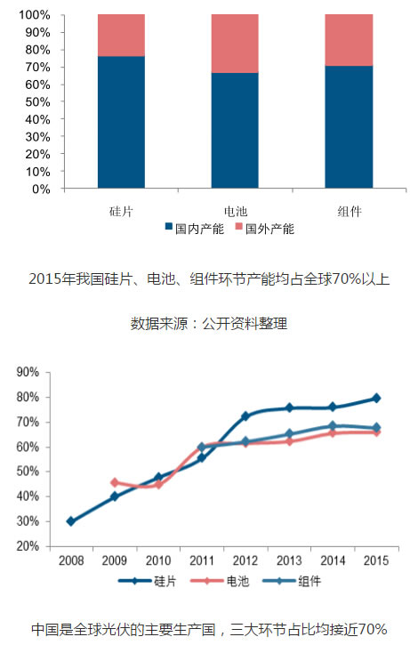 我國作為全球光伏產(chǎn)業(yè)鏈的主要生產(chǎn)國,2006年以來產(chǎn)業(yè)鏈市占率持續(xù)提升。目前,不管是硅片,還是電池組件,均在全球占據(jù)主力地位。根據(jù)數(shù)據(jù),2015年我國硅片、電池、組件產(chǎn)能占比均超過70%,產(chǎn)量分別占到全球的79.60%、67.72%、66.02%。