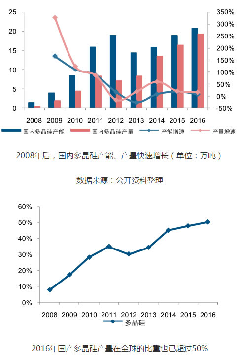 然而,相比于硅片-電池-組件產(chǎn)業(yè)鏈,國內(nèi)多晶硅產(chǎn)業(yè)發(fā)展相對滯后,2008年以前國內(nèi)多晶硅產(chǎn)量占全球產(chǎn)量不足10%,導致國內(nèi)光伏產(chǎn)業(yè)長期受制海外硅料企業(yè)。此后,國內(nèi)企業(yè)開始加速布局多晶硅產(chǎn)能,帶動國內(nèi)多晶硅產(chǎn)量及占比持續(xù)提升,2016年國內(nèi)多晶硅產(chǎn)量19.3萬噸,占世界總產(chǎn)量的50.26%。