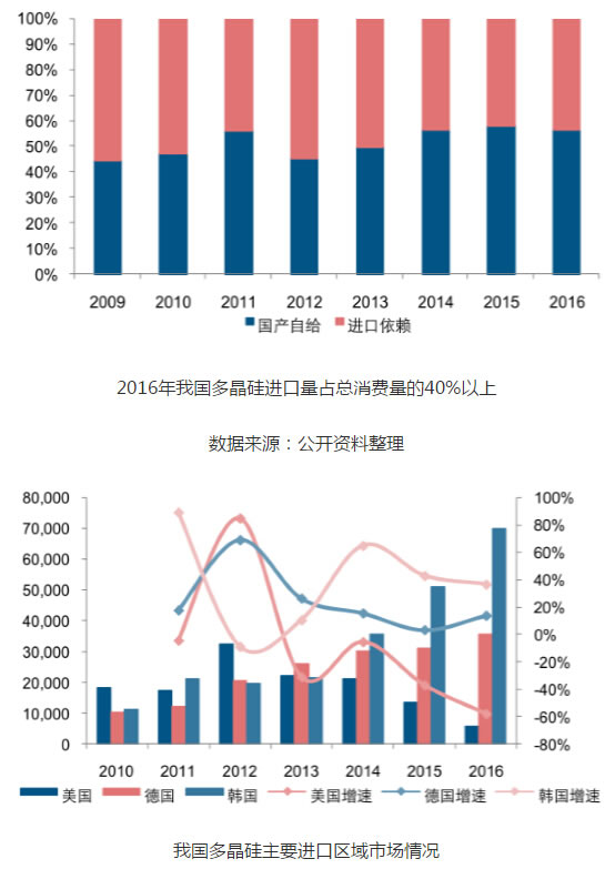 根據(jù)數(shù)據(jù),2016年我國多晶硅進口14.1萬噸,同比增長25.67%,進口規(guī)模占總消費量的40%以上。其中,從韓國進口7.01萬噸,同比增長36.92%;從德國進口3.57萬噸,同比增長14.01%。從美國進口0.56萬噸,同比減少56.76%。