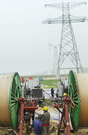 本次架線施工從3月18日開始,施工現(xiàn)場位于黃河灘地,風(fēng)沙較大。為了保證導(dǎo)線安全穩(wěn)定地跨越黃河,架線使用的導(dǎo)線具有截面大、張力大、比重大等技術(shù)特點,其鋼芯截面積為240平方毫米,是特高壓工程常用的1000平方毫米導(dǎo)線鋼芯截面積的3倍,導(dǎo)線比重為4.373千克/米,單根導(dǎo)線展放張力約為8.6噸。為了適應(yīng)導(dǎo)線特性,河南送變電工程公司專門為本次工程設(shè)計制造了目前國內(nèi)最大噸位的張力機,還專門研制了大噸位地錨、放線架、卡線器等一系列配套的施工工器具,為本次黃河大跨越標(biāo)段架線施工順利進(jìn)行提供了強有力的技術(shù)支撐。