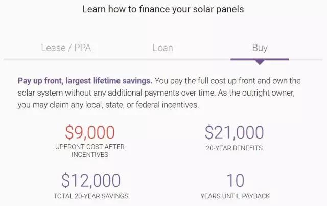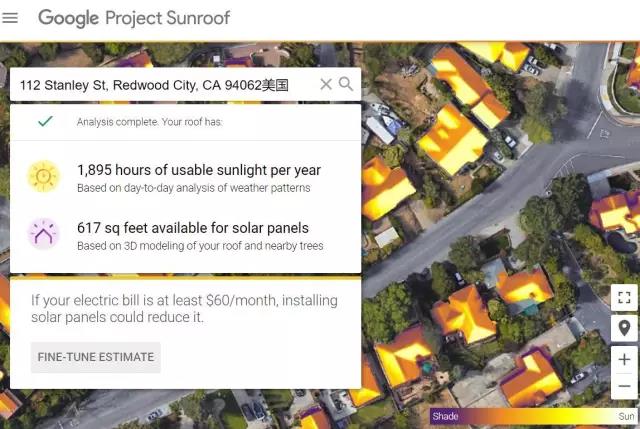 以圖中的美國用戶地址為例,每年有1895小時的可用陽光資源,可用屋頂面積617平方英尺,如果用戶每月電力賬單不低于60美金,安裝屋頂光伏長期來看就可以節(jié)省電費。