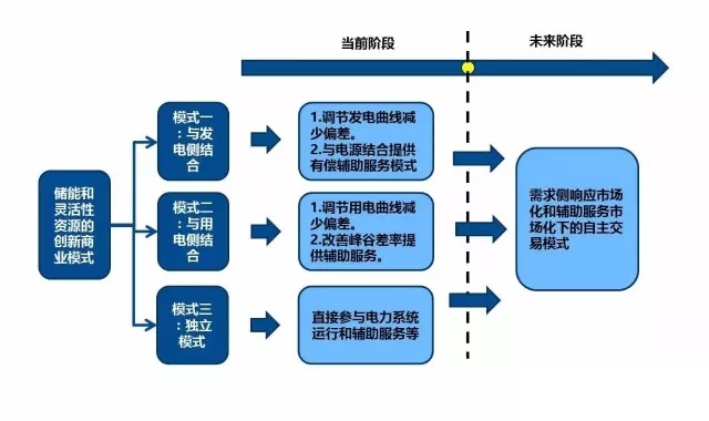 輔助服務市場建立還在摸索階段,可通過儲能和靈活性資源商業(yè)模式的創(chuàng)新,來逐步建立和完善輔助服務市場。在當前階段,商業(yè)模式的創(chuàng)新可通過與市場不同主體間的結(jié)合來實現(xiàn)。