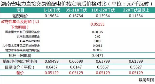湖南省發(fā)改委于2017年1月1日便開始執(zhí)行輸配電價核定后的銷售電價。晶見計算得出,如果依據(jù)湖南省發(fā)改委關(guān)于省電網(wǎng)2017-2019年輸配電價有關(guān)問題中通知及其附件內(nèi)提到的“參與電力市場的用戶購電價格由市場交易價格、輸配電價(含線損和交叉補貼)和政府性基金組成;未參與電力市場的用戶,執(zhí)行政府規(guī)定的電價”,參與直接交易的電力用戶或者售電公司就需要繳納比目錄電價更高昂的電費,差價將達(dá)到5.1分。