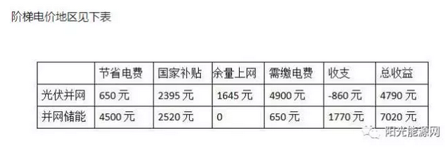 在實(shí)行階梯電價(jià)地區(qū),安裝儲(chǔ)能后收益就更大。如這個(gè)用戶所在地區(qū),年用量在2000度以下電價(jià)是0.65元/度,年用量在2000-4000度以下電價(jià)是0.8元/度,年用量在4000度以下電價(jià)是1元/度,兩種方案客戶的收益對比