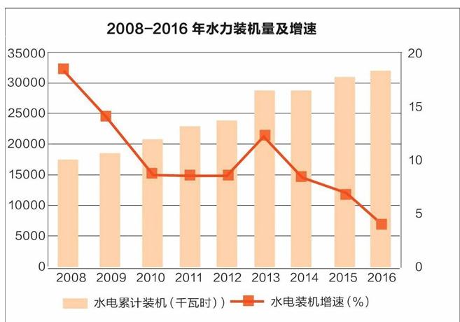 這種情況,直到2009年,節(jié)能減排的壓力加大后才有所緩解。在這一年,中國提出了2020年非化石能源消費占能源消費總量15%的目標,同時作出了2020年單位GDP能耗降低40%到45%的承諾。由于當時的風電和太陽能規(guī)模不大,因此在決策層看來,水電是最現(xiàn)實的推動節(jié)能減排的替代能源。自2010年起,中央政府開始逐漸對水電松綁,一批之前有爭議的項目紛紛重啟。這段曲折的經(jīng)歷投射到水電裝機量上,表現(xiàn)在2010和2011年的水電裝機增速出現(xiàn)了明顯的下滑趨勢,直到2013年后,西南地區(qū)解禁的水電項目逐漸落地投產(chǎn),才推遲了水電裝機增速放緩的勢頭。