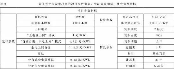 項(xiàng)目所在工業(yè)園區(qū)成立了園區(qū)分布式光伏示范項(xiàng)目的開發(fā)協(xié)調(diào)機(jī)構(gòu)(園區(qū)管委會(huì)),負(fù)責(zé)協(xié)調(diào)發(fā)電企業(yè)與園區(qū)用能企業(yè)簽訂屋頂協(xié)議與合同能源管理協(xié)議,與園區(qū)所屬電網(wǎng)公司簽訂余電上網(wǎng)收購協(xié)議。在此模式下,業(yè)主獲得電費(fèi)與補(bǔ)貼收入,用電企業(yè)享受優(yōu)惠電價(jià)與節(jié)能效益,園區(qū)管委會(huì)負(fù)責(zé)協(xié)調(diào)屋頂與并網(wǎng)接洽并收取少量手續(xù)費(fèi),促進(jìn)協(xié)議的簽訂和項(xiàng)目的正常運(yùn)營,實(shí)現(xiàn)了多方共贏。本項(xiàng)目業(yè)主方集開發(fā)商、設(shè)備供應(yīng)商、EPC承包商為一體,有利于發(fā)揮組織與協(xié)調(diào)優(yōu)勢,減少商業(yè)與操作風(fēng)險(xiǎn),在簡化商業(yè)模式的同時(shí),促進(jìn)光伏電池組件、逆變器等設(shè)備的消納,形成多方互惠共贏的商業(yè)化運(yùn)作模式。表2列出了分布式光伏發(fā)電項(xiàng)目的項(xiàng)目參數(shù)指標(biāo)、經(jīng)濟(jì)效益指標(biāo)和社會(huì)效益指標(biāo)。