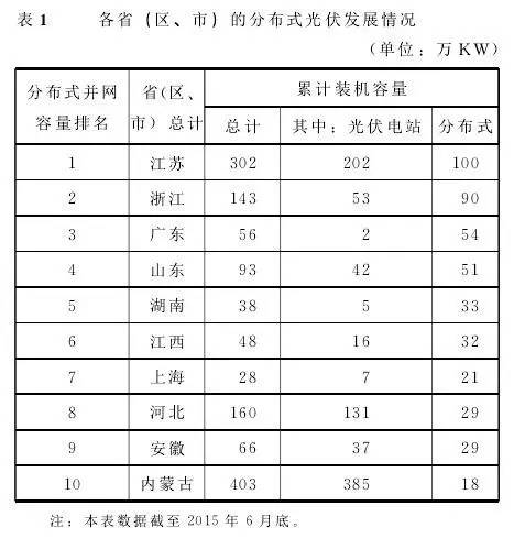 從國際發(fā)展水平看,中國由于電網(wǎng)特點(diǎn)與開發(fā)條件,分布式光伏處在探索與發(fā)展階段,與全球發(fā)達(dá)國家相比仍存在差距。目前,發(fā)展較快的省份主要集中在中、東部地區(qū),排名前五位的省份是江蘇(100萬KW)、浙江(90萬KW)、廣東(54萬KW)、山東(51萬KW)和湖南(33萬KW)。中國的分布式光伏發(fā)展以“金太陽”工程和工業(yè)園區(qū)項(xiàng)目為主,住宅項(xiàng)目也在逐漸興起。各省份的分布式光伏的發(fā)展情況如表1所示。