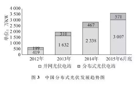 目前,全國28個(gè)有分布式光伏發(fā)電項(xiàng)目的省份中,浙江、湖南、廣東等地區(qū)的分布式光伏發(fā)電占比較高。此外,中國分布式光伏發(fā)電裝機(jī)容量超過100MW的省份超過10個(gè),成為世界分布式光伏領(lǐng)域的重要市場。截至2015年6月底,光伏電站裝機(jī)容量達(dá)3578萬KW,其中分布式光伏電站裝機(jī)容量達(dá)571萬KW,占比16.0%,近年來中國分布式光伏的發(fā)展情況見圖3。