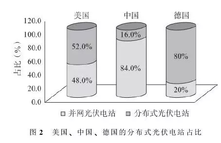 截至2014年年底,全球光伏電站裝機(jī)容量為1.89億KW,同比增長35.9%,全年光伏新增裝機(jī)容量為4700萬KW,同比增長21.7%,其中一半以上是分布式光伏電站。截至2014年年底,美國的光伏發(fā)電裝機(jī)容量為1202萬KW,其中分布式光伏電站并網(wǎng)裝機(jī)容量為625萬KW,占比約52%;德國光伏電站裝機(jī)容量為3590萬KW,其中分布式電站裝機(jī)容量為2800萬KW,占比約80%(見圖2)。