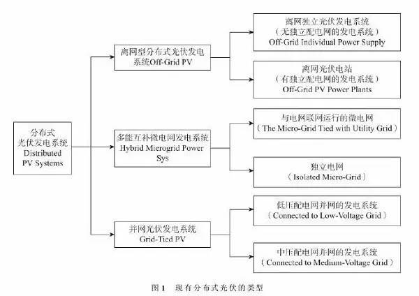 (1)根據(jù)并網(wǎng)特性與運(yùn)行方式的不同,可分為并網(wǎng)光伏發(fā)電系統(tǒng)、離網(wǎng)型分布式光伏發(fā)電系統(tǒng)、多能互補(bǔ)微電網(wǎng)發(fā)電系統(tǒng)(見圖1)。