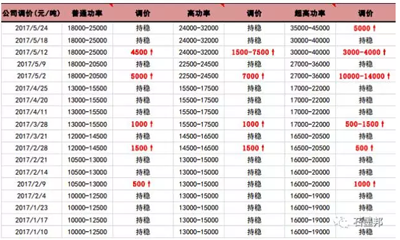 目前價(jià)格相比于年初,普通功率產(chǎn)品上調(diào)比例達(dá)80%-100%,高功率產(chǎn)品上調(diào)比例達(dá)85%-115%,超高功率產(chǎn)品上調(diào)比例達(dá)120%-135%;