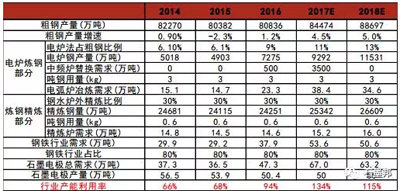 預(yù)計(jì)2017年實(shí)際取代需求約為3500萬噸,帶來石墨電極需求增量約為10.5萬噸。由于中頻爐產(chǎn)能不在國家統(tǒng)計(jì)數(shù)據(jù)范圍之內(nèi),因此表外這部分需求未來將被替代轉(zhuǎn)化為表內(nèi)需求(粗鋼產(chǎn)量)。