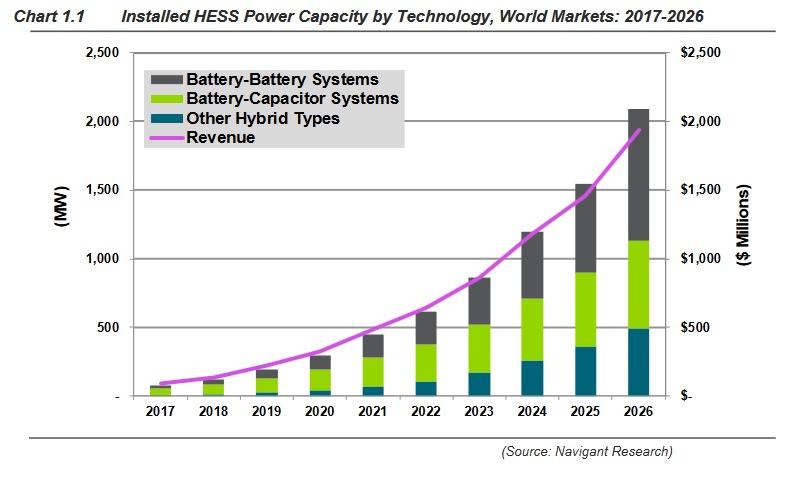 中國儲能網訊:根據(jù)國際市場研究機構Navigant Research的報告,結合多種互補技術的混合儲能系統(tǒng)將改變儲能市場的面貌,預計到2026年混合儲能系統(tǒng)部署容量達2.1吉瓦。