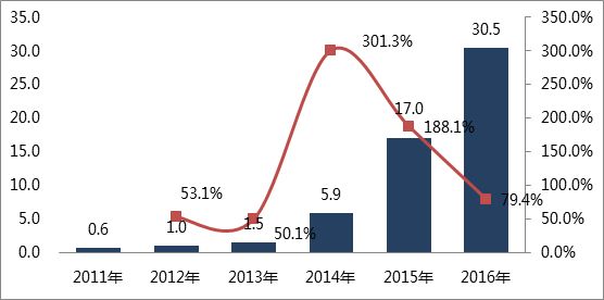 2011-2016年中國(guó)鋰動(dòng)力電池出貨量:Gwh
