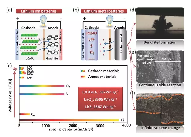 c)典型電極材料在電壓和容量方面的比較,LMBs的能量密度遠大于LIBs;