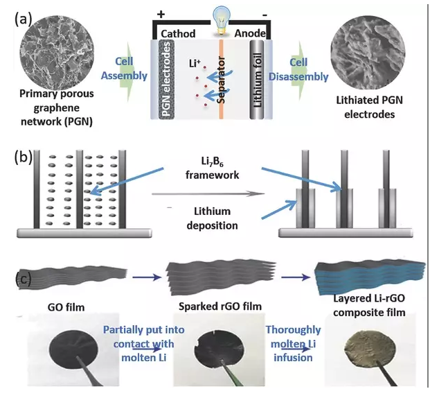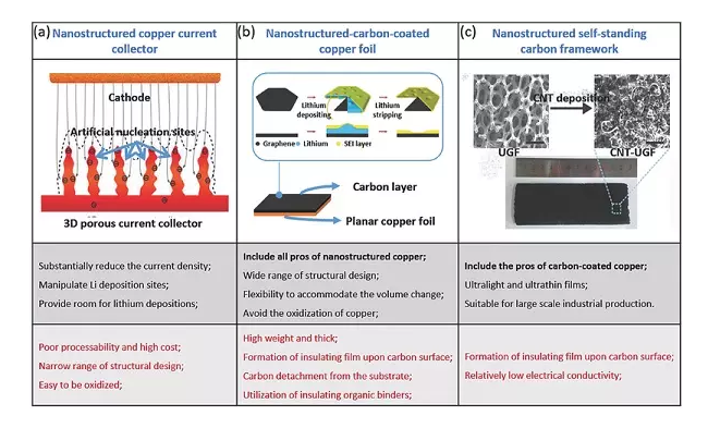 鋰粉末和表面改性的鋰箔可以作為平面鋰箔的替代物,以延遲枝晶的產(chǎn)生。負極的表面積大大增加以提供相當大的沉積位置,從而在一段時間內(nèi)抑制枝晶生長。然而,鋰箔的表面狀態(tài)和粉末之間的邊界不會持續(xù)很長時間,并且整個箔在長時間循環(huán)中會變成隨機分散的鋰微結(jié)構(gòu)的聚集體。相比之下,集流體(CCs)方法取得了較好的表現(xiàn),傳統(tǒng)銅箔被納米結(jié)構(gòu)化的材料代替。之后為了避免納米結(jié)構(gòu)銅的缺點,開發(fā)了碳涂覆的銅箔,這些碳涂層都貢獻了更好的電化學性能,這與其優(yōu)異的導電性、高比表面積和合適的孔徑/體積比具有密切的關系。與納米結(jié)構(gòu)或碳涂層銅箔相比,自支撐碳膜本身可直接作為CCs,能夠避免有機粘合劑或碳脫落產(chǎn)生的導電性所帶來的不利影響。