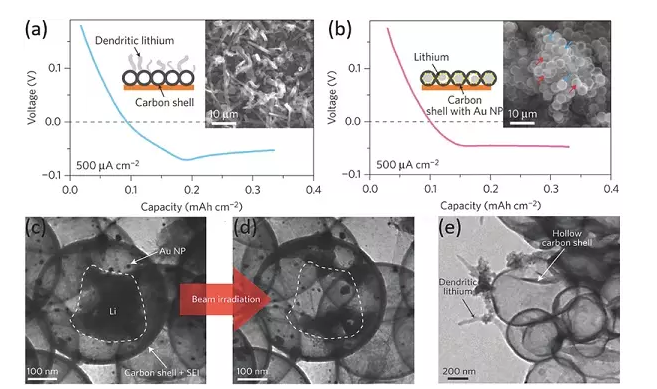 c-e)鋰沉積(c)、原位電子束加熱(d)后具有Au NPs的納米膠囊,鋰沉積后沒有Au NPs的碳殼(e)的TEM圖像。
