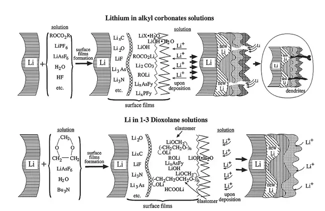 通常,本征SEI層由各種有機物(低聚物和聚合物)和無機物組成,其中有機部分賦予SEI層柔性以適應鋰沉積,而無機部分能夠?qū)崿F(xiàn)快速的鋰離子傳輸。然而,無機碳酸鋰(Li2CO3)和鋰乙烯碳酸氫鈉(LEDC)作為兩個主要的SEI組分,在鋰沉積電位附近是熱力學不穩(wěn)定的,并且允許循環(huán)中反應發(fā)生,而氧化鋰(Li2O)是唯一的熱力學和動力學穩(wěn)定的組分,最里面的SEI層中的Li2O薄層是非常重要的,以避免在沒有氟化物源的情況下破裂。此外,化學和物理各向異性在SEI層內(nèi)是常見的,同時導致異質(zhì)鋰通量和不均勻沉積。沉積和溶解時,由無機離子香料組成的表面不能適應形態(tài)變化,因此可能會分解,導致高度不均勻的鋰沉積,使得枝晶形成。迄今為止,選擇合適的溶劑、鋰鹽和添加劑可以有效和高效地調(diào)節(jié)SEI層的性質(zhì)。