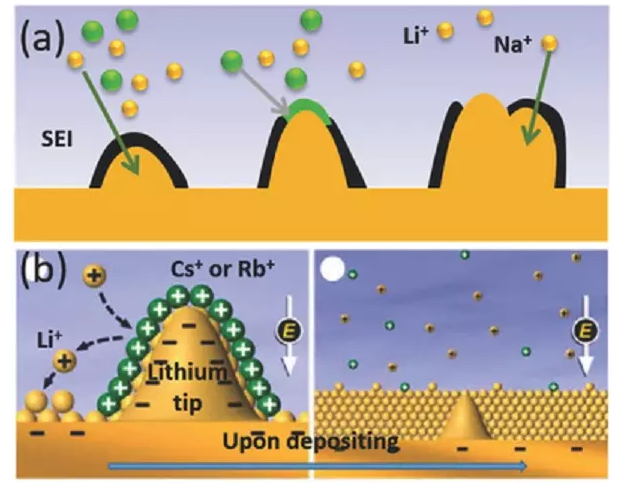 b)自愈式靜電屏蔽機制。Cs+或Rb+將積聚在尖端附近以形成靜電屏蔽,排斥Li+沉積在負極附近區(qū)域。