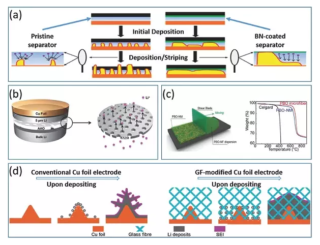 常規(guī)的非織造聚合物或微孔隔膜太脆弱以至于不能抵抗枝晶,對鋰沉積行為沒有顯著影響。這里開發(fā)了改進的中間層,以進一步保證電池的性能,這主要是通過與枝晶或鋰離子通量的相互作用。這里,中間層具有不同的功能,包括專門設計的分離器或附加的保護層,以彌補分離器的弱點。