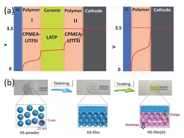 a)聚合物/陶瓷/聚合物-三明治電解質(zhì)(左),內(nèi)部曲線是固體混合電解質(zhì)和單個固體聚合物電解質(zhì)的電勢分布圖(右);