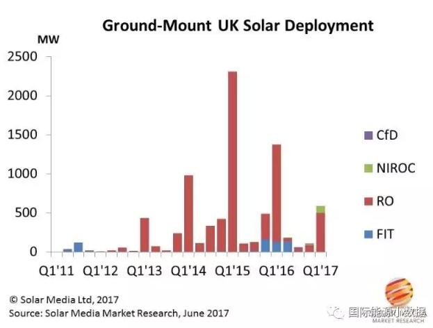 英國可再生能源義務(wù)證書(RenewableEnergyCertificate)對地面光伏項(xiàng)目的激勵政策在2017年3月31日到期,英國光伏開發(fā)商在2017年第1季度搶裝了640兆瓦爭取補(bǔ)貼的最后一班車。再往后,英國光伏就主要靠市場競爭力來說話了。