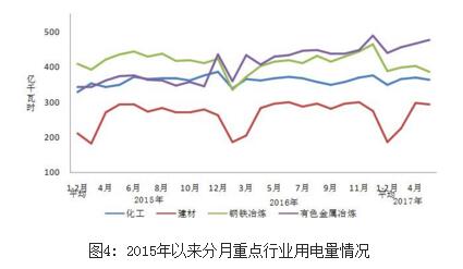 1-5月份,化學(xué)原料制品、非金屬礦物制品、黑色金屬冶煉和有色金屬冶煉四大高載能行業(yè)用電量合計7216億千瓦時,同比增長6.9%,增速比上年同期提高10.5個百分點;合計用電量占全社會用電量的比重為29.7%,對全社會用電量增長的貢獻率為32.0%。其中,化工行業(yè)用電量1795億千瓦時,同比增長3.3%,增速比上年同期回落1.1個百分點;建材行業(yè)用電量1191億千瓦時,同比增長3.3%,增速比上年同期提高4.8個百分點;黑色金屬冶煉行業(yè)用電量1952億千瓦時,同比增長4.2%,增速比上年同期提高14.4個百分點;有色金屬冶煉行業(yè)2279億千瓦時,同比增長14.5%,增速比上年同期提高19.5個百分點。