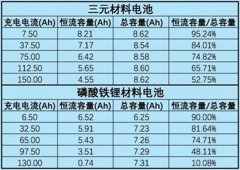 從表中可以看出,三元鋰電池與磷酸鐵鋰電池在10C以下充電時(shí),恒流比無(wú)明顯差距,10C以上倍率充電時(shí),磷酸鐵鋰電池恒流比例迅速降低,充電效率迅速降低。