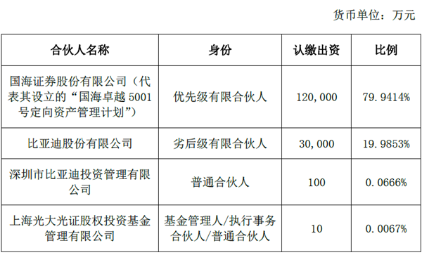 公告顯示,投資基金規(guī)模為人民幣150,110萬元,其中深圳市比亞迪投資管理有限公司認(rèn)繳出資人民幣100萬元;上海光大光證股權(quán)投資基金管理有限公司認(rèn)繳出資人民幣10萬元;比亞迪股份有限公司認(rèn)繳出資人民幣30,000萬元;國海證券股份有限公司認(rèn)繳出資人民幣120,000萬元;基金管理人為上海光大光證股權(quán)投資基金管理有限公司。
