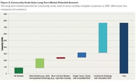 根據(jù)落基山研究所的最新報(bào)告,美國(guó)無(wú)法安裝屋頂太陽(yáng)能設(shè)備的家庭和商業(yè)建筑所需的社區(qū)規(guī)模太陽(yáng)能市場(chǎng)潛在規(guī)模達(dá)到了750GW以上。(見(jiàn)下圖)