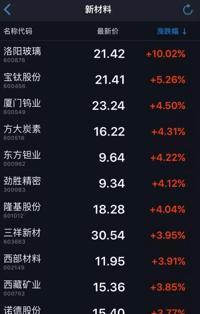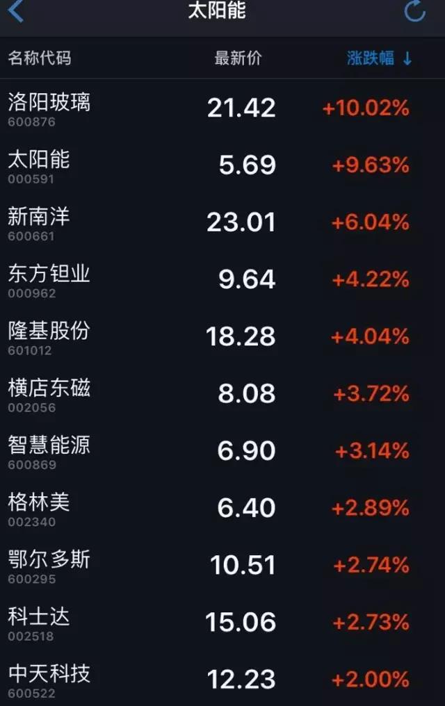 首先我們來看看隆基所處的幾個(gè)板塊漲幅:新材料和太陽(yáng)能領(lǐng)域,上漲4%以上的公司不是太多,隆基排在前六。