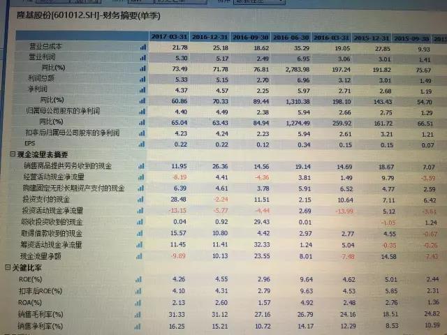 前圖的數(shù)字中也能發(fā)現(xiàn),“銷售商品提供勞務(wù)收到的現(xiàn)金”這一欄里,隆基的現(xiàn)金獲取穩(wěn)定,2016年第一季度~2017年第一季度的數(shù)字分別是:近15億、19.14億、14.56億、26.36億和11.95億。