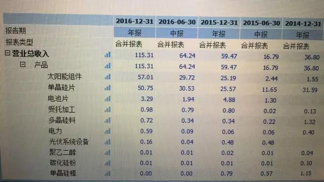 從產(chǎn)品類型來看,公司的單晶硅片在同期上升,但組件也已成為核心收入來源。2014年,單晶組件還僅僅只有1.55億元的進(jìn)賬,2年之后,收入突飛猛進(jìn),達(dá)到了57.01億元,已占據(jù)了公司年?duì)I收的一半。這部分的收入,大量來自于樂葉。