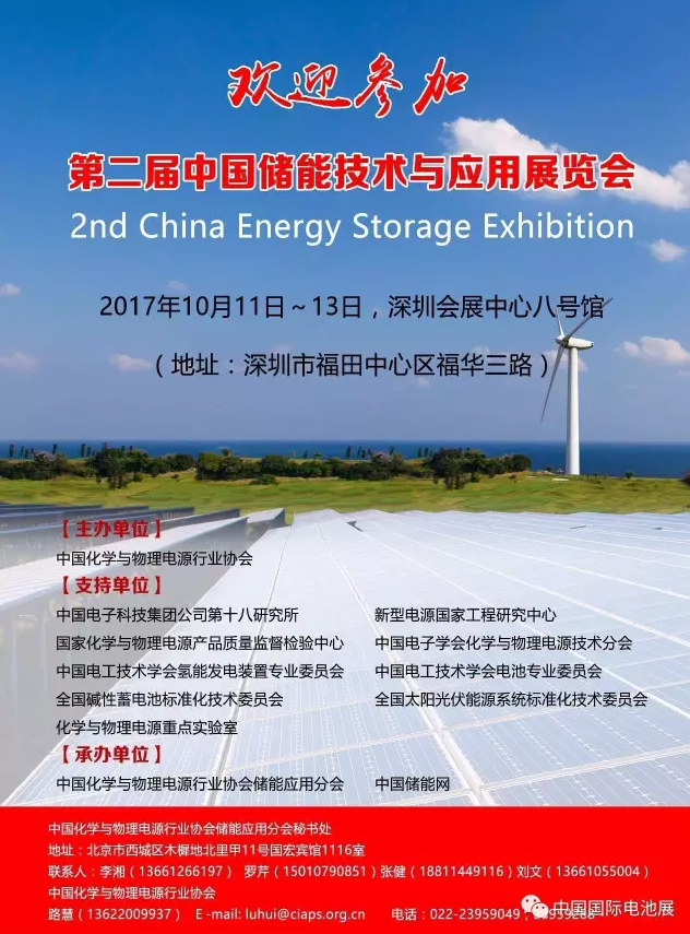 2017年,儲能技術(shù)在新能源微網(wǎng)、能源互聯(lián)網(wǎng)、多能互補(bǔ)、電能替代、備用電源、新能源汽車、光儲充電站等應(yīng)用領(lǐng)域和應(yīng)用類型逐步明晰,儲能應(yīng)用效果和應(yīng)用價值也日趨明確。為進(jìn)一步推動儲能技術(shù)創(chuàng)新發(fā)展,加快儲能技術(shù)商業(yè)化應(yīng)用,中國化學(xué)與物理電源行業(yè)協(xié)會決定于2017年10月11—13日在深圳會展中心舉行“第二屆中國儲能技術(shù)與應(yīng)用展覽會”。本次展會由中國化學(xué)與物理電源行業(yè)協(xié)會儲能應(yīng)用分會和中國儲能網(wǎng)聯(lián)合承辦。